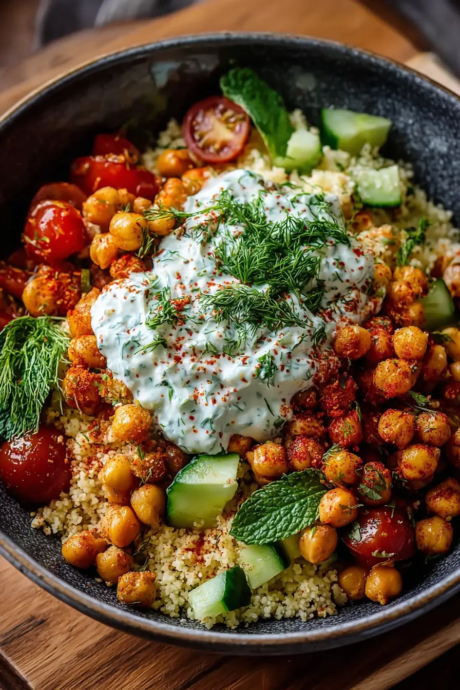 Every forkful brings balance—soft, chewy, crispy, and creamy all at once. The couscous acts as a warm, nutty canvas for the seasoned chickpeas, fresh veggies, and that lush herbed yogurt. The smoky spice from the chickpeas and the garlicky tang of the dressing create a Mediterranean harmony that’s deeply satisfying.