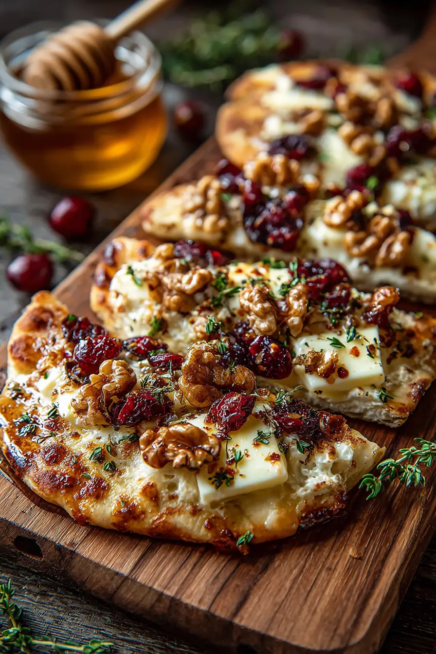 - Crispy Flatbread with Brie, Cranberries & Toasted Walnuts with a Hot Honey Drizzle