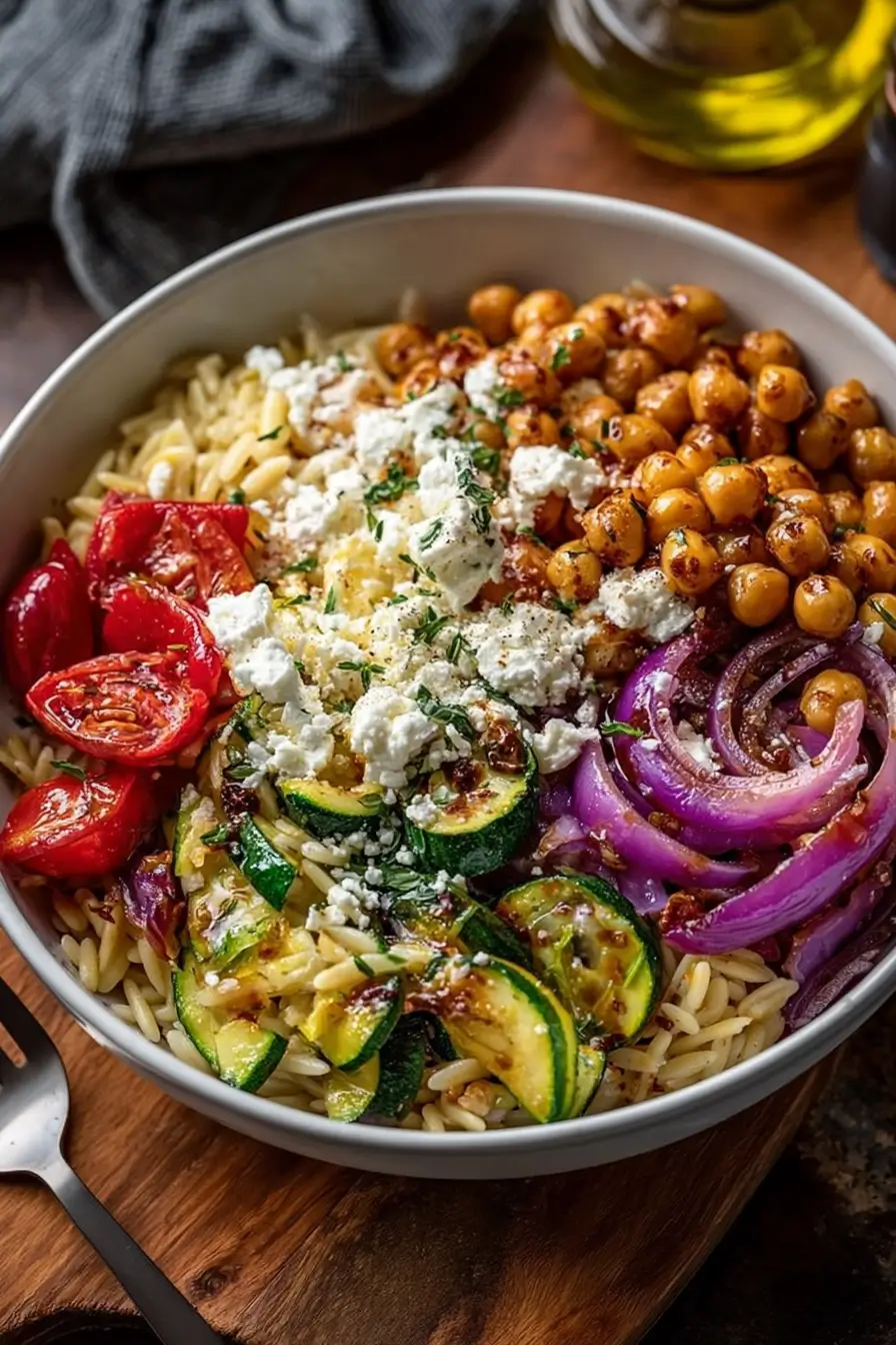 - Assemble the bowl: Combine cooked orzo, roasted veggies and chickpeas, and crumbled feta in a large bowl.