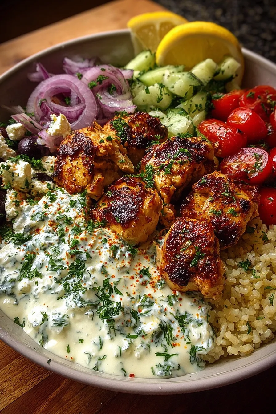 Greek Chicken Souvlaki Bowls with Lemon Feta Sauce: 5-Star Flavor in 30 Minutes