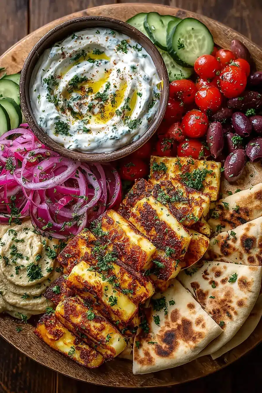 What you’ll need is simple: a skillet for the halloumi, a sharp knife for slicing, and a large serving platter for arranging. No fancy equipment. If halloumi is tricky to find in your area, you can sub in a good block of feta—though it won’t fry the same way. For pita, naan works beautifully. And for dairy-free friends, coconut yogurt makes a surprisingly good base for the drizzle.