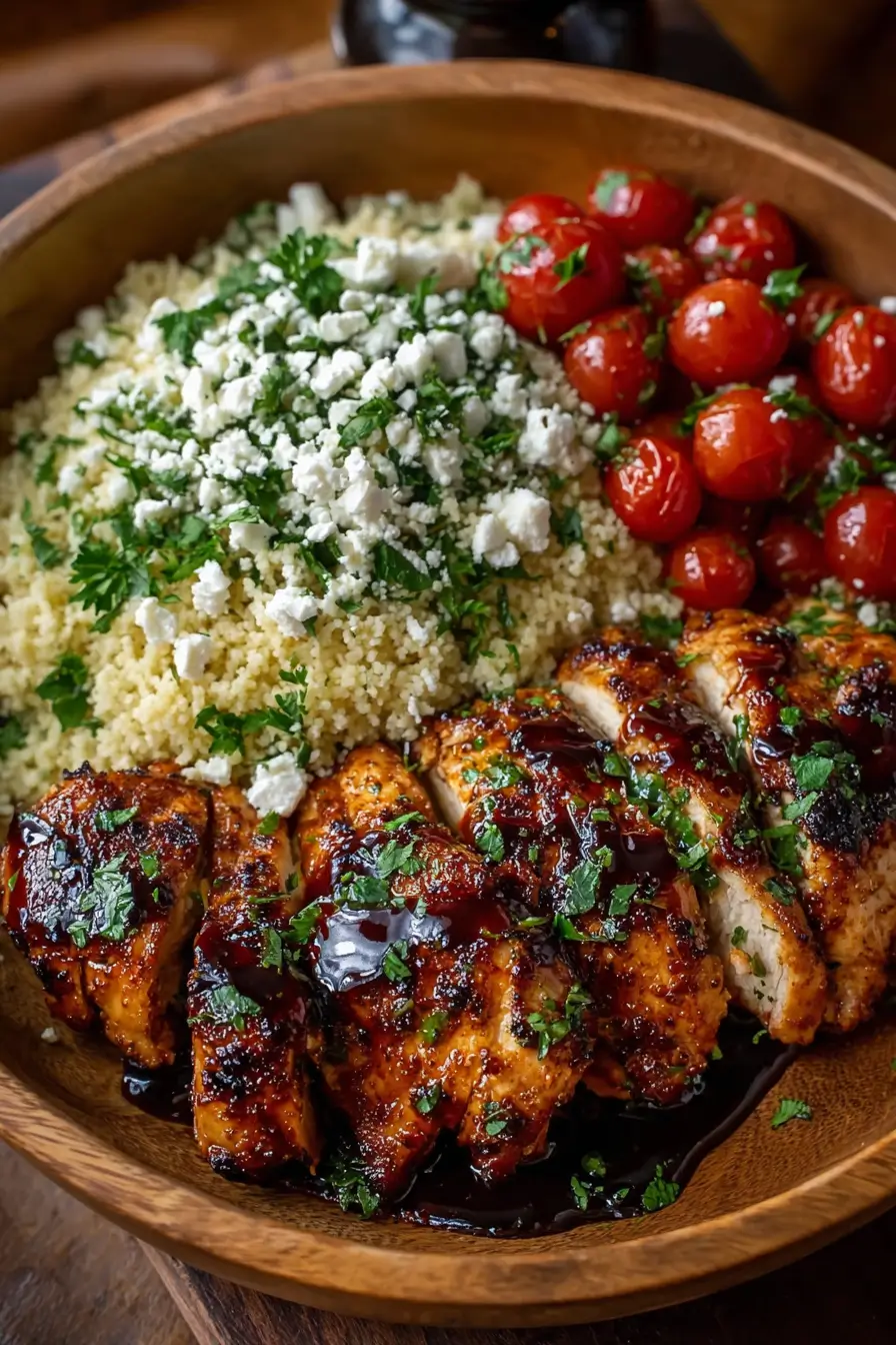 Think savory-sweet chicken with a tangy glaze, spooned over couscous that soaks up all those juices. Every bite has a contrast—soft couscous, crumbly feta, bright herbs, juicy tomatoes. It’s satisfying without being heavy, light enough for warm days but cozy enough for cooler ones.