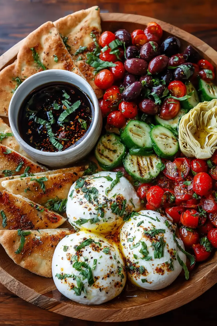 There’s a reason people rave about burrata boards. The combination of creamy cheese, crisp pita, and fresh vegetables is absolutely irresistible. Unlike heavy dishes, this platter feels light but indulgent at the same time. It’s visually stunning, which means even if you’re just throwing it together last minute, it looks like you spent hours prepping. The mix of textures—from the soft burrata to the crunchy cucumbers and warm pita—keeps every bite exciting.