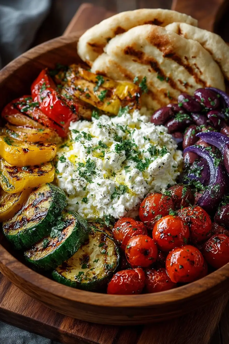 Now, arranging is where the fun begins. Start with your roasted veggies in little clusters—it helps the colors pop instead of blending together. Tuck the feta crumbles in between, scatter olives in small piles, then drizzle everything with olive oil. Finally, place the pita bread around the edges so it doubles as decoration and dipping tool.