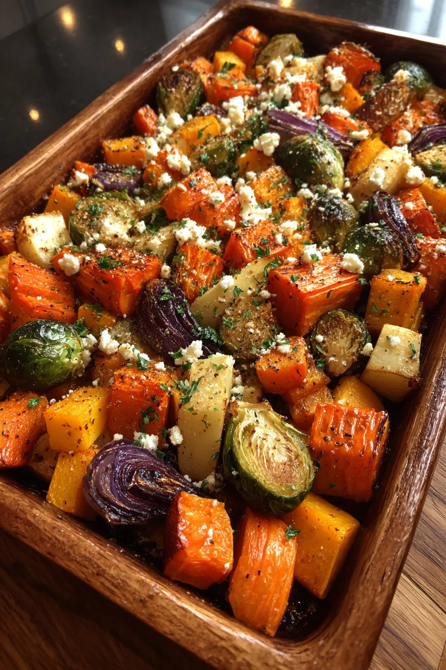 Roasted Brussels Sprouts, Sweet Potato, Butternut Squash, Carrot & Beet Medley with Maple-Feta Crumble, Walnuts & Cranberry-Honey Glaze has that warm, cozy, holiday smell that instantly reminds me of bustling Christmas kitchens, crackling ovens, and tables filled with color. Honestly, the moment the vegetables start caramelizing—those edges turning golden, the maple syrup softening into this velvety glaze—you’ll swear the season got a little more magical. And here’s the thing: this isn’t just another roasted veggie tray. This one brings textures… colors… layers. Soft meets crisp, sweet meets tangy, warm meets bright. It’s the kind of side dish that steals attention from the main event.
